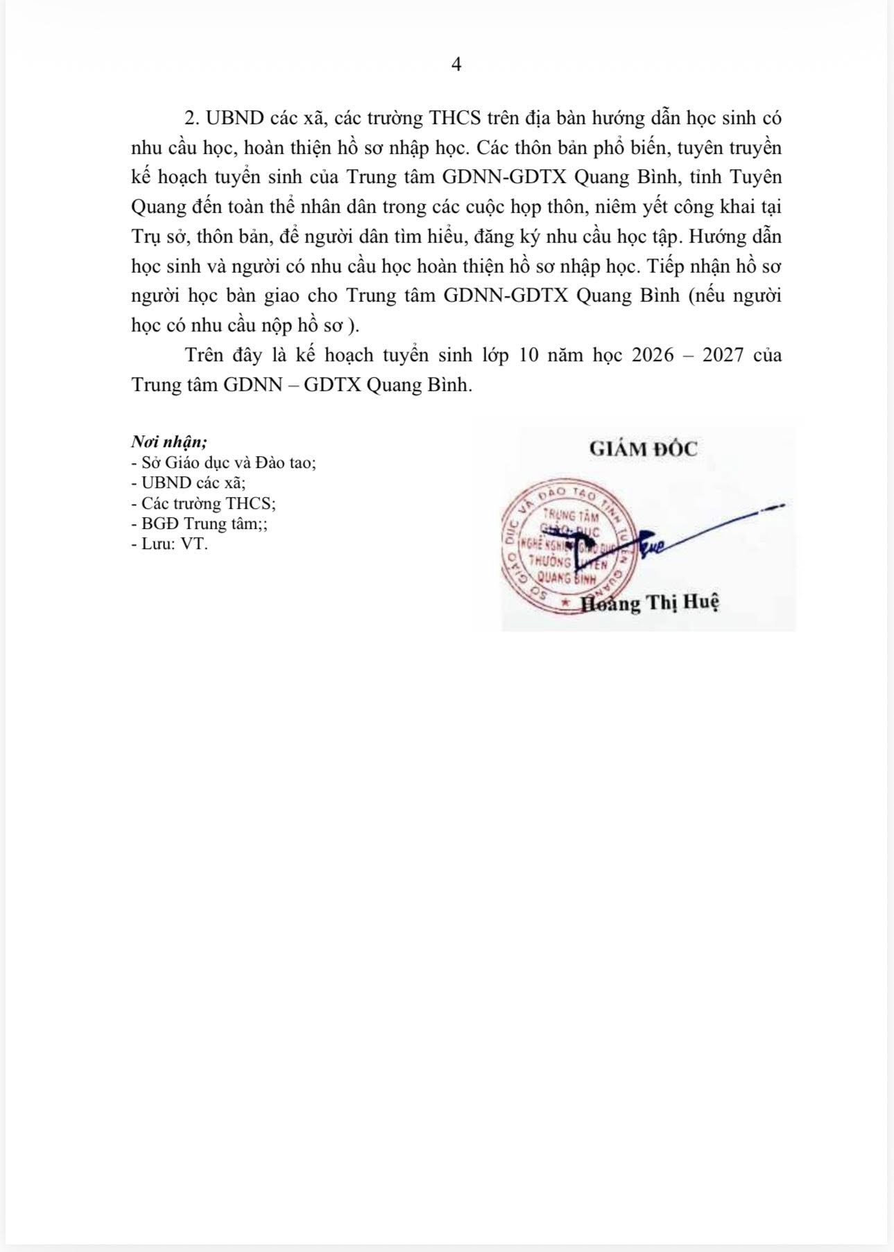 20 °C KẾ HOẠCH Tuyển sinh vào 10 chương trình GDTX cấp THPT năm học 2026 - 2027