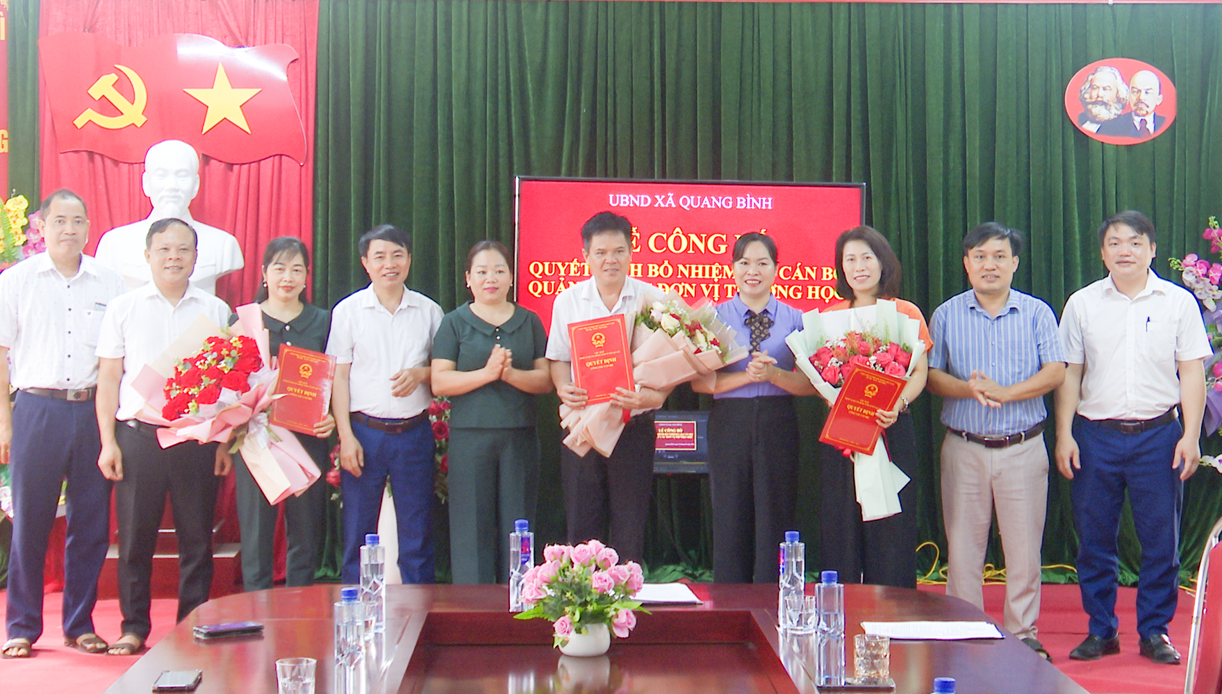 Cũng tại buổi làm việc, UBND xã Quang Bình đã tổ chức công bố các Quyết định bổ nhiệm lại cán bộ quản lý các đơn vị trường học, cụ thể: Quyết định Bà Lê Thị Thanh Hà tiếp tục giữ chức vụ Phó Hiệu trưởng Trường PTDT Bán trú THCS Tân Nam. Ông Hoàng Thanh Tùng tiếp tục giữ chức vụ Phó Hiệu trưởng Trường PTDT Bán trú Tiểu học Tân Nam. Và bà Hoàng Thị Dinh tiếp tục giữ chức vụ Phó Hiệu trưởng Trường Mầm non Tân Nam.