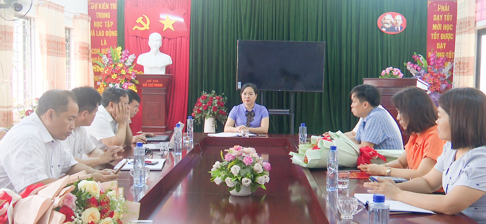 Đồng chí Hồ Thị Hồng Lam, Phó Chủ tịch Thường trực UBND xã Quang Bình phát biểu tại buổi làm việc với các nhà trường
