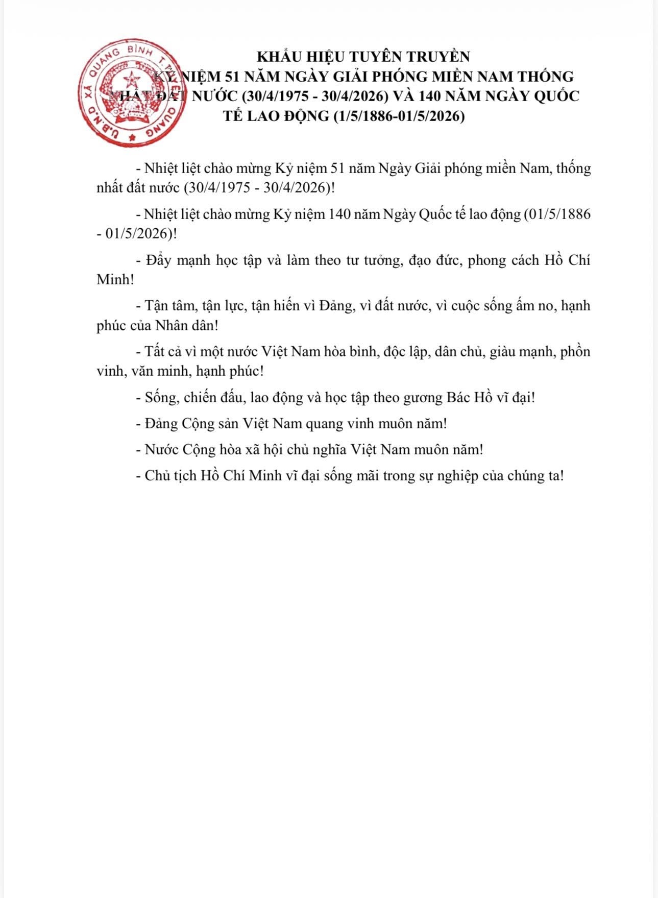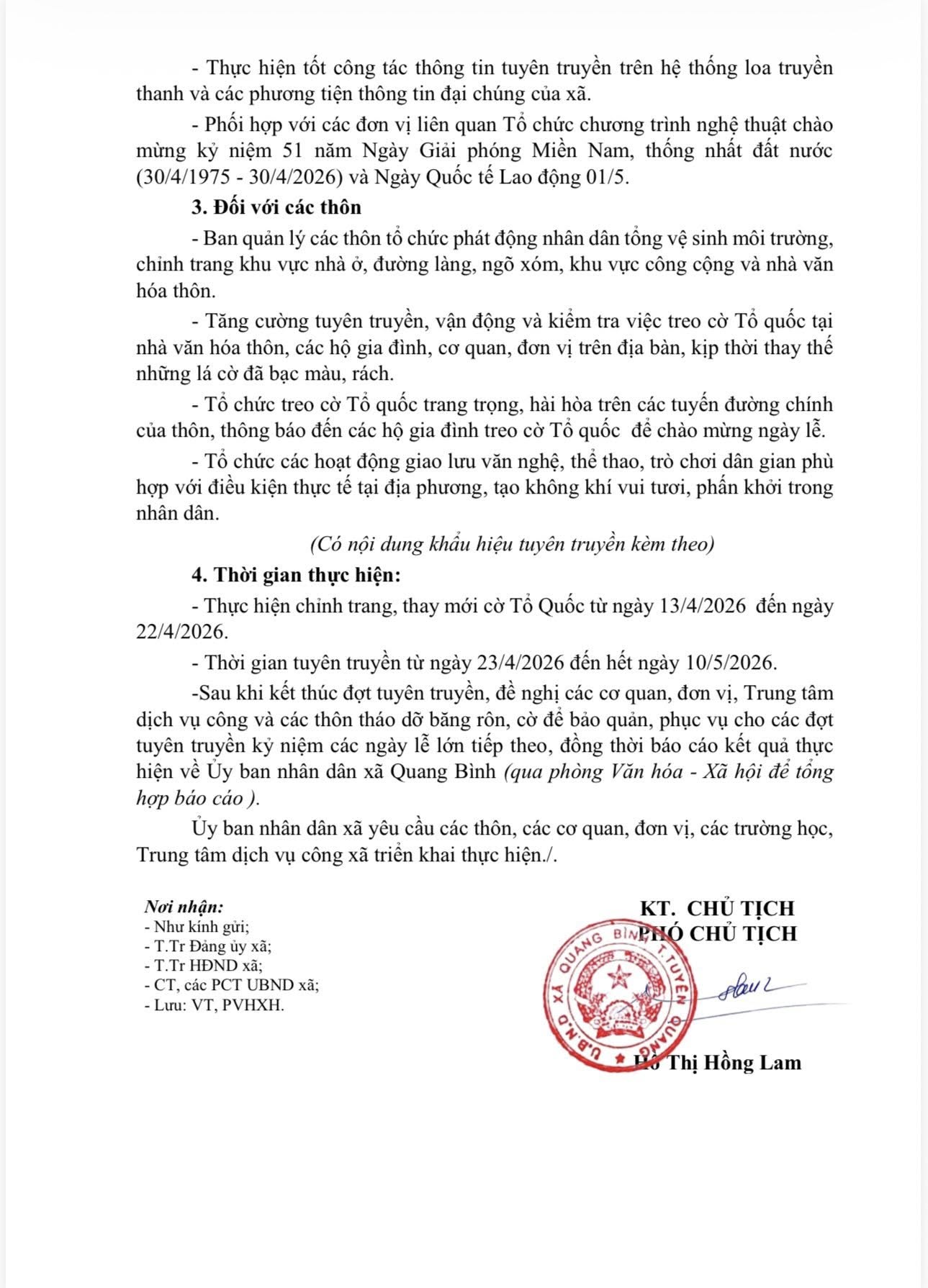 ổ chức hoạt động tuyên truyền, chỉnh trang khuôn viên, treo cờ Tổ quốc chào mừng kỷ niệm 51 năm Ngày Giải phóng miền Nam thống nhất đất nước (30/4/1975 - 30/4/2026) và 140 năm ngày Quốc tế Lao động (01/5/1886 -01/5/2026)